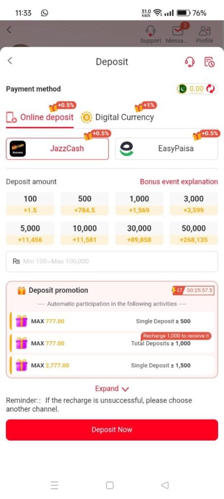 The minimum deposit is kept low so beginners can easily get started. Players can begin with as little as a few hundred PKR using JazzCash or Easypaisa.